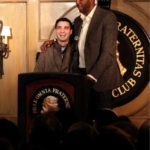 Portraying North Korean leader Kim Jong-un, riding in on the back of a Secret Service agent, the Churchill native waved an American flag while shouting greetings to the former NBA star he was there to roast.