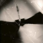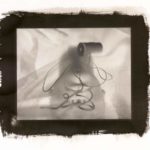 To make photograms, Goshay took black-and-white photo-enlarging paper into the darkroom, exposed it to light with a flashlight randomly, and folded up and stomped on and scratched up the surface before putting it into the developer.