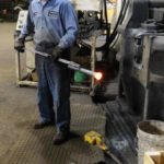 Sometimes old-style work needs equipment the same age. Wessel uses a 1900-era Hossfield Bender to put the curve in railroad uncoupling hooks.