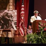 Flanking the stage on opposite sides was a recent portrait of Hutchinson and a photograph of him as a Marine Corps gunnery sergeant serving in the Pacific Theater in World War II.
