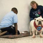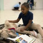 Students settle in with a book, a dog and the dog's owner, who also helps the student work through the book, and read out loud for about 15 minutes.