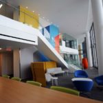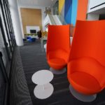 Every floor also has an “inner circle” — a small glass-walled circular conference room available for private meetings.
