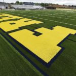 While there are lines all over the field to mark soccer and lacrosse areas, their colors blend rather than clash with football lines. Soccer lines are a different shade of green, boys lacrosse lines are black, and girls lacrosse lines are blue.