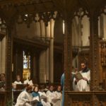 The relative plainness of Calvary continues inside until you see the rood screen — an intricately carved oak divider that separates the altar area of the church from the nave — and the similarly carved oak backdrop to the altar.