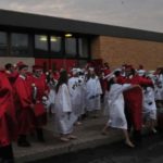 Family members, who arrived early, huddled under the football field's concession stand and under umbrellas before making a dash into the gym. School band member Sydney Morse wrung rainwater from her clothes before picking up her flute to play “Pomp and Circumstance.”