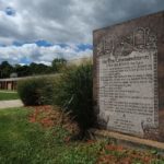 The large stone monument sits in front of the high school near the gymnasium entrance.