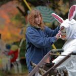 After a recent blustery day, Jenny moved through the trees near the edge of her property, stepping among the handmade tombstones. She secured the stakes on the figures of a rabid rabbit devouring a hunter, on the ZZ Top ghoul strumming his guitar and the Ronald Reagan monster that she picked up for a buck one year at a flea market.