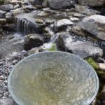 Near the bottom of the waterfall is a big, pretty chartreuse hosta that is a focal point and looks happy with the water falling all around it.