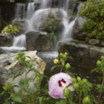 To the left of the waterfall, interspersed through gigantic rocks, are carefully chosen perennials, trees and shrubs. A tree hydrangea is in full bloom with pure white conical flowers. Bright-yellow black-eyed Susans set off the dark-purple leaves of various Japanese maples.
