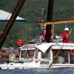 Footage from Springfield, Missouri, television station KYTV showed a crane attached to a barge pulling the duck boat from Table Rock Lake and another boat pushing the vessel toward shore.